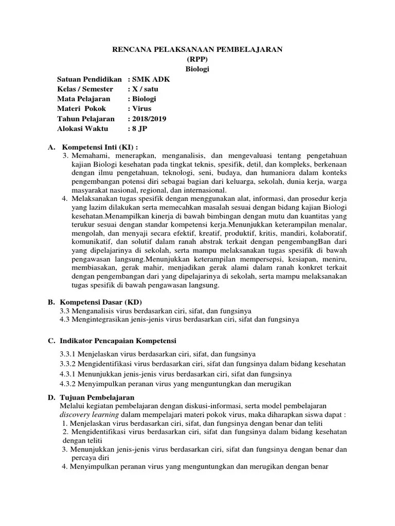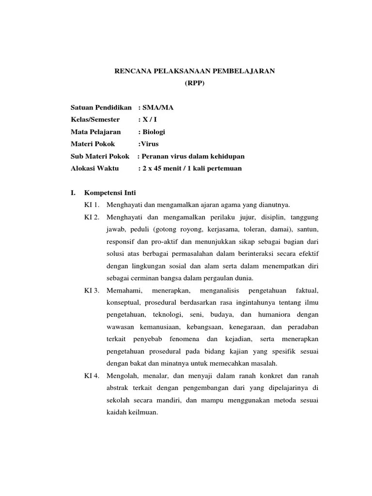 Virus berukuran mikroskopik virus dapat hidup pada sel inangnya virus memiliki 1 materi genetik saja replikasi virus terjadi secara litik maupun . Meningkatkan hasil belajar pada materi virus kelas x man 4 aceh besar. Rencana pelaksanaan pembelajaran (rpp) materi virus yang dikembangkan guru biologi kelas x sma di nganjuk merupakan sasaran dalam penelitian ini. Rencana pelaksanaan pembelajaran (rpp) i. Rpp mata pelajaran biologi kelas xrencana pelaksanaan pembelajaran (rpp)mata.